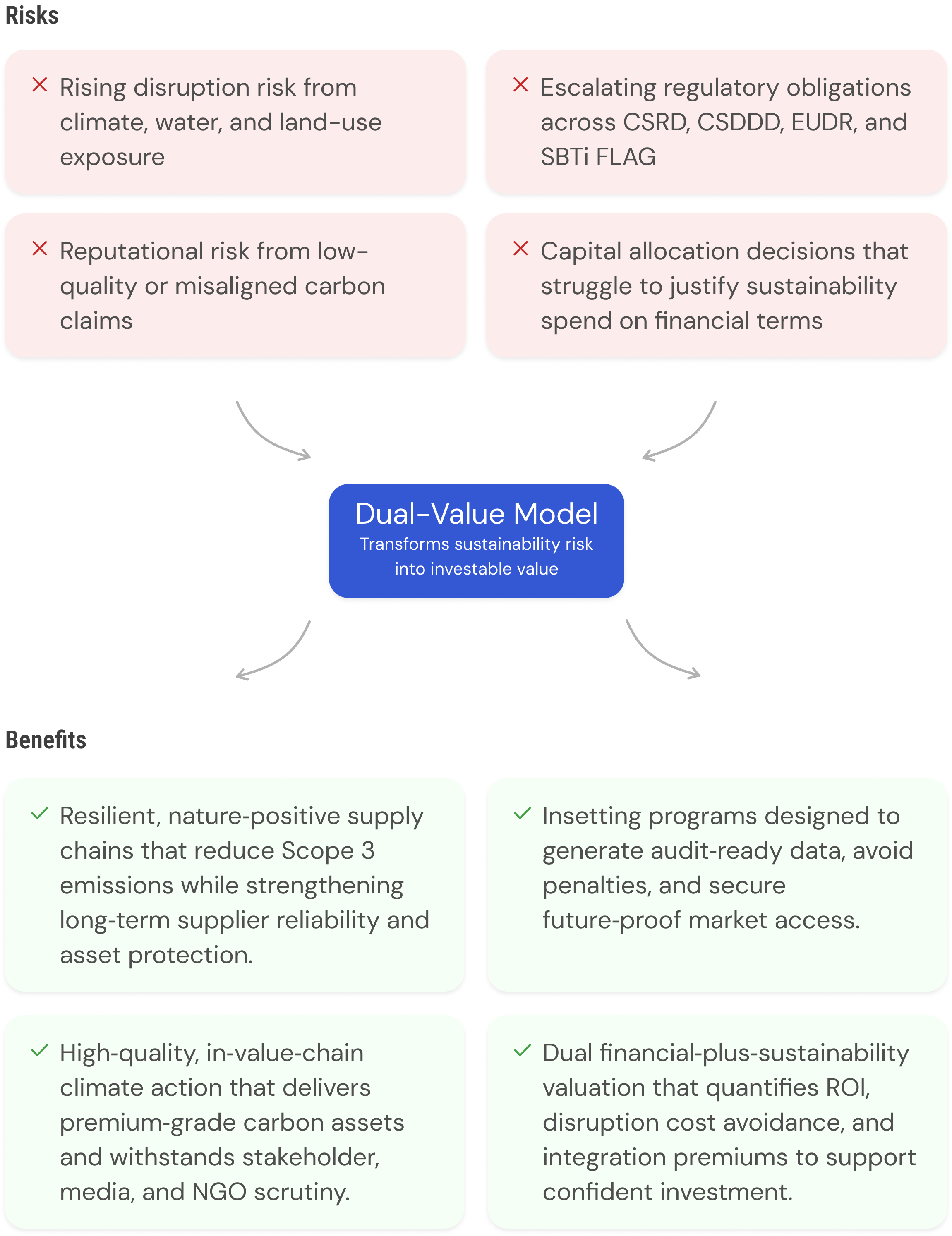 Carbon Credit Capital’s Dual-Value Model is an enterprise sustainability solution that embeds nature-based solutions directly into supply chains, transforming sustainability investment from a reporting obligation into a measurable source of operational and financial value.